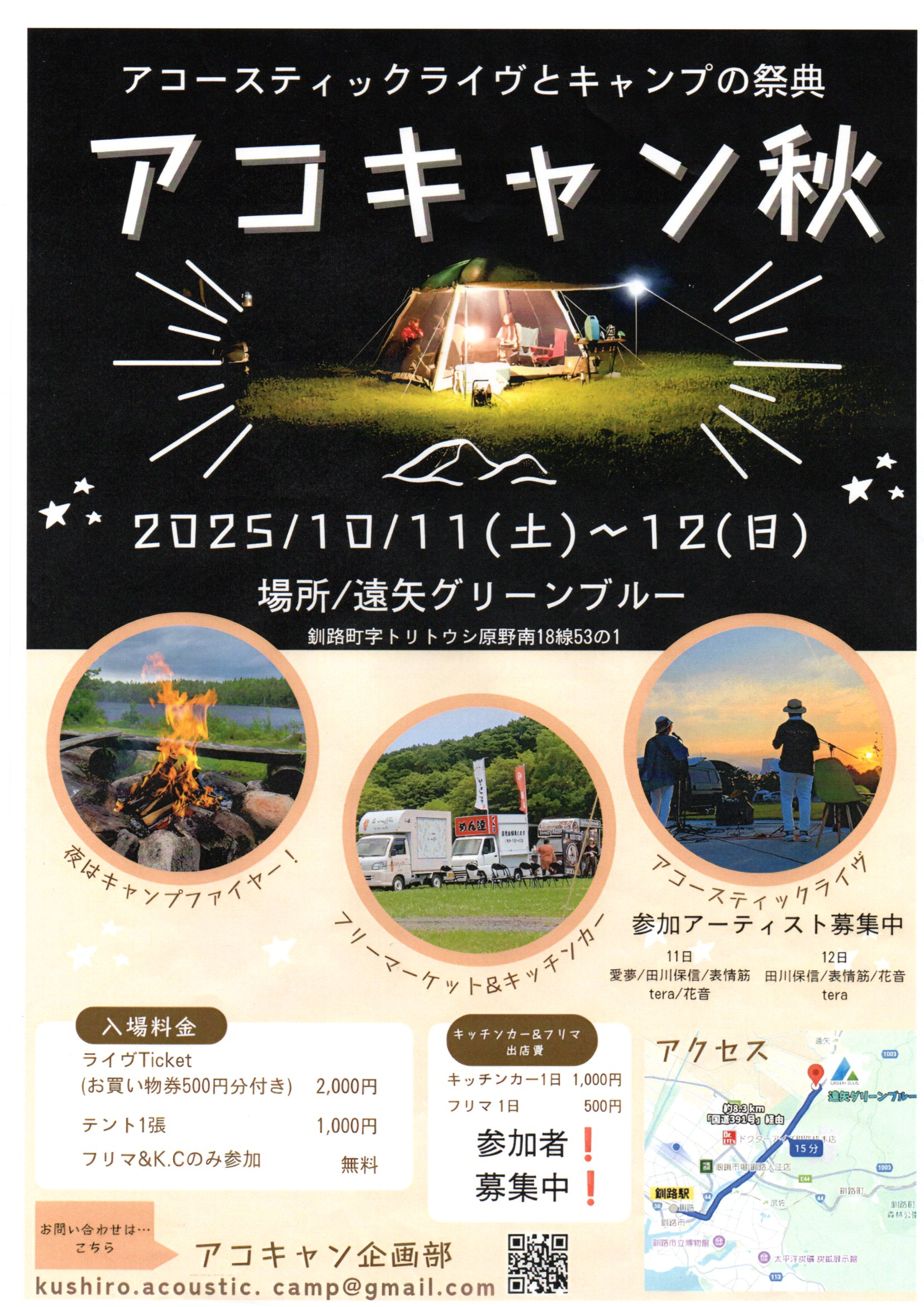 釧路町遠矢「グリーン・ブルー」という多目的会場で初めて行われたアコースティックLIVEとキャンプの祭典「アコキャン'2025.7 」